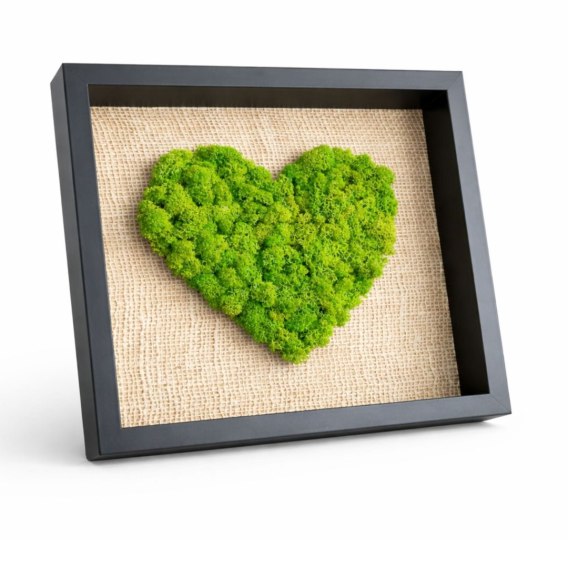 Obraz z sercem z mchu fińskiego będzie doskonałym, nietypowym prezentem na wiele okazji: