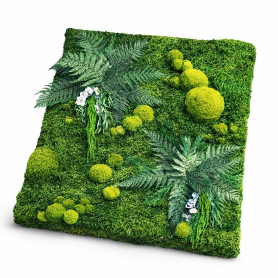 Panel ścienny z mchu płaskiego I poduszkowego z dodatkiem roślin stabilizowanych