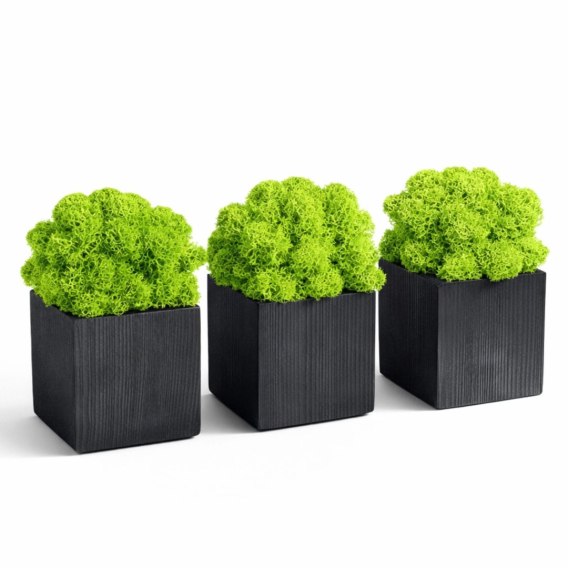 Doniczki wypełnione są stabilizowanym mchem chrobotkiem fińskim w odcieniach zieleni. Dzięki procesowi stabilizacji mech: