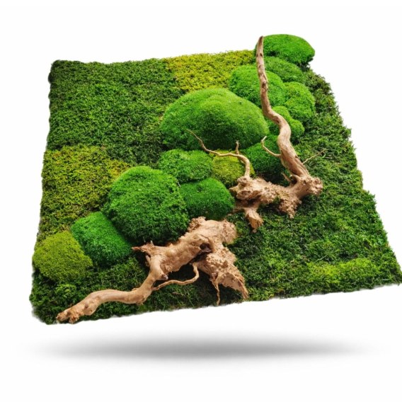 Panel ścienny z mchu płaskiego I poduszkowego z korzeniem japońskim