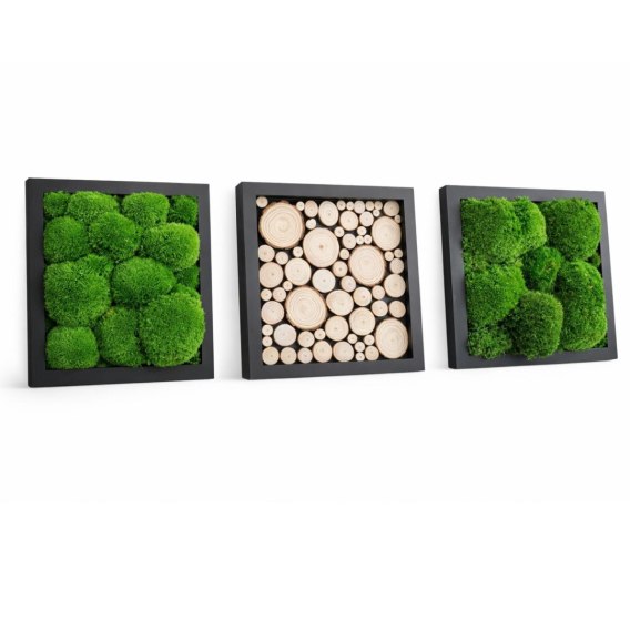 Tryptyk z mchu poduszkowego i plastrów drewna - naturalna dekoracja ścienna 3×40x40 cm